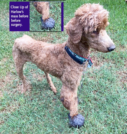Harlow is a beautiful 2yr old, 40lb, Standard Poodle. She was purchased from a breeder as a puppy. The people who bought her returned her to the breeder in the most deplorable condition imaginable. Her right front leg had two large growths and the paw had a huge black mass that appeared necrotic–the leg was also very inflamed. She was skin and bones and had an eye that appeared infected. Without hesitation, we agreed to take Harlow. Our doctors and Oncologist agreed that immediate surgery was needed. She is now recovering in a foster home while we await her test results.